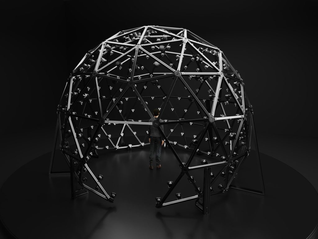 The geodesic sphere provides the perfect structure for mounting cameras and lights, ensuring complete, even coverage of the subject for a perfect 3D head scan.